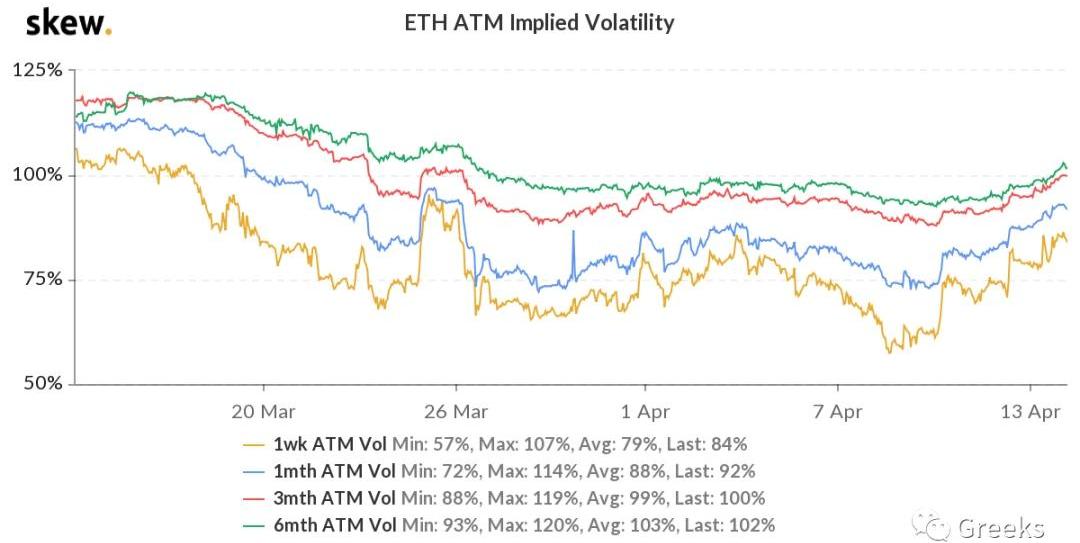 以太坊今日期權成交量3.44億美元,持倉量36億美元,創造歷史新高。10d88%30d79%90d106%1Y90%各標準化期限IV:今日:1m92%,3m99%,6m101%4/13:1m89%,3m96%,6m99%以太坊的IV近幾天有明顯的上升,從本輪回調的1600美元至今都已經有50%的漲幅了,以太坊整體曲面已經開始越過100%。