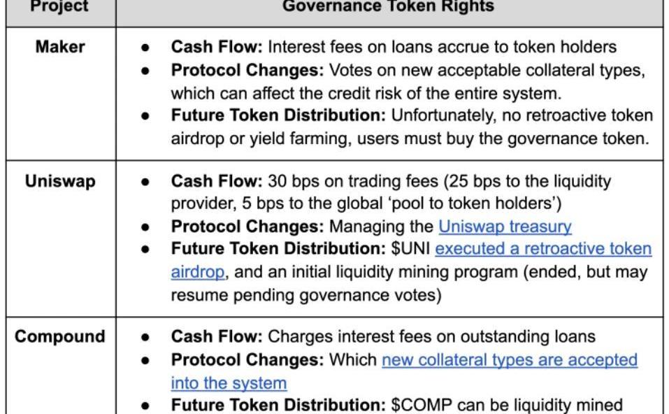 為什么對去中心化協議的控制和影響很有價值?簡而言之,治理代幣傳遞某些特權,包括:現金流量分配權:協議可能會向其用戶收取費用。這些費用在收取之后,治理投票可以決定將部分費用分配給代幣持有人,類似于股票紅利。更改協議的權利:如前所述,代幣授予其所有者對協議的未來進行投票的權利。例如,大多數項目都允許代幣持有人對智能合約代碼更改和資金管理進行投票。代碼更改代表應用程序的直接業務邏輯。在某些情況下,這些決定可能非常重要,類似于董事會對公司的戰略方向進行投票。對這些決策的控制和影響很重要,一些政黨愿意為此付出可觀的代價。資金管理通常關注通常分配給“社區活動”的代幣的百分比,這是一種預算,用于資助有益的項目和功能開發。對這些決策的影響是對協議未來方向的控制權的另一擴展。未來代幣分發的權利:一些項目使得通常可以通過流動性挖礦向協議的用戶鑄造新代幣。該想法是為協議的用戶按比例分配治理,從而導致更深層次的保留和參與。治理代幣通常用于設置這些參數。以下是這些維度上現有DeFi項目的一些示例: