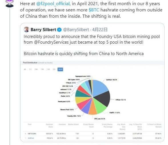 ChunWang重新發布了DigitalCurrencyGroup的BarrySilbert在4月22日發布的數據,該數據顯示,位于美國的比特幣礦池FoundryUSA在4月份攀升至全球前五名礦池之列,占哈希率的7.6%。Silbert表示:“比特幣的哈希值正在迅速從中國轉移到北美。”領先的礦池仍然是由中國挖礦硬件設備制造商Bitmain經營的AntPool,在總算力中占18.6%的份額。按今日btc.com提供的數據,FoundryUSA位列全球礦池的第9名,另一個知名的海外礦池SlushPool排名第10,全球算力之爭可謂相當激烈。