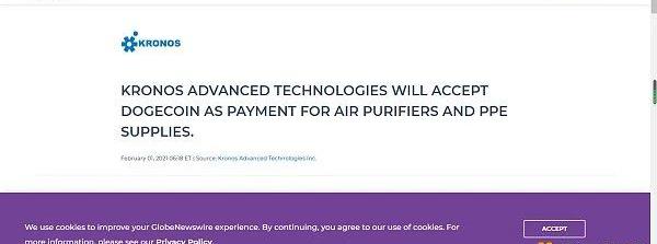 金色財經報道,專注于空氣凈化技術的上市公司KronosAdvancedTechnologies宣布將接受Dogecoin作為空氣凈化器和PPE用品的付款方式。