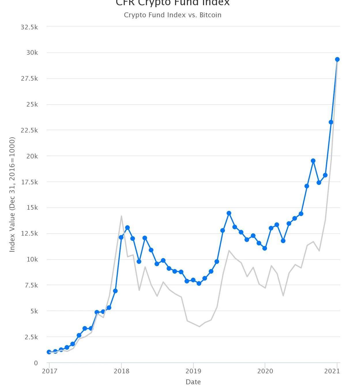 XRP/HKD-0.67%牛市來了,萬物復蘇,一切都活躍起來了,區塊鏈項目方、加密貨幣基金、個人及機構投資者等紛紛入場“掃貨”。為了趁好時機快速布局,“財團”們不僅投單體項目,連投資基金也一并入手,既不錯過項目,也不想錯過基金投項目帶來的高預期收益。這就催生了強強聯合,弱者沒份的“掠奪”模式。于是,在牛市未落幕前,為了和時間賽跑,個人投資者開始托關系找資源,二級市場已經不能滿足預期回報,參與進一級市場才是“王道”。因此,加密貨幣基金的數量、管理資金規模、活躍度、回報率都再次攀升,CryptoFundReasearch數據統計,自2020年9月開始,基金表現幾乎與比特幣同頻甚至高于。