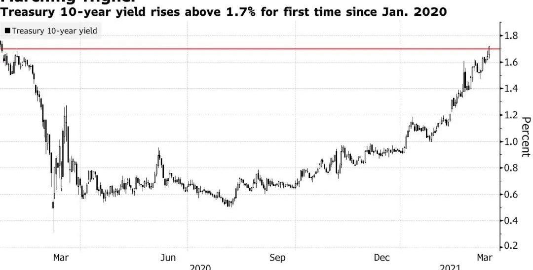 當10年期美國國債收益率上升時,投資者對風險資產的胃口往往會下降,因為投資者可以在美國國債中尋找更安全的收益率替代品。盡管比特幣與道瓊斯指數并沒有緊密的相關性,但它與以科技股為主的指數(比如標準普爾500指數)有著密切的相關性。正如Cointelegraph此前報道的那樣,這表明美國國債的強勁勢頭導致風險資產停滯不前,隨后比特幣也出現下跌趨勢。美國國債收益率從3月19日開始突破關鍵水平。從那以后,比特幣一直在盤整,很難突破6萬美元。Welt市場分析師HolgerZschaepitz表示:美國國債收益率突破了關鍵水平,同時債券交易員加大押注,他們認為隨著美國經濟復蘇,美聯儲將允許通脹超過目標水平。10年期國債收益率已突破1.75%,但未遇到上漲的“真正障礙。