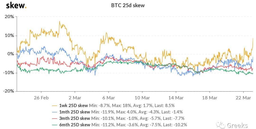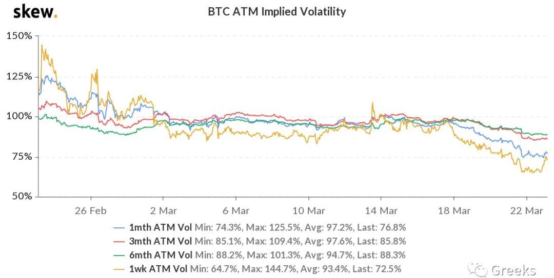 XRP/HKD-0.94%播報數據由Greeks.live和Skew.com提供。最近幾個月每到當月交割周就會有一波持續性行情,近三個月都是下跌。如今又到了交割周,今天就迎來一波下行,走勢如何讓我們拭目以待。BTC歷史波動率10d74%30d80%90d94%1Y69%期權成交量11億美元,期權持倉量為120億美元。各標準化期限隱含波動率:今日:1m76%,3m87%,6m89%3/22:1m78%,3m86%,6m88%比特幣的一月內期限IV有所反彈,其他主要期限IV繼續下降,超短期IV受價格移動影響比較明顯,總體來看買入意愿不強烈。正如昨日播報提到,持續下降的波動率可能至少要維持到交割之后。