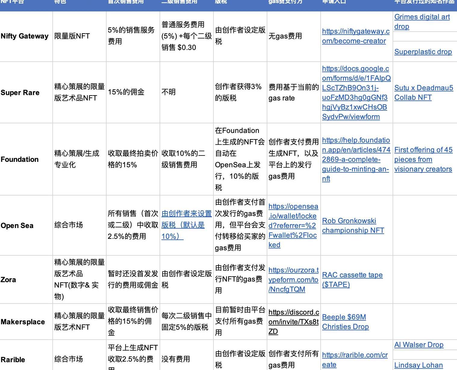前言:隨著NFT的爆發,NFT平臺也開始崛起,交易量一直在上漲。根據Cryptoart的統計,目前加密藝術品NFT總價值超過4億美元,各個平臺共銷售出超過15萬個藝術品NFT;根據Cryptoslam的統計,目前30天銷售量超過100萬美元的收藏品NFT內容平臺有8個,其中NBATopShot的銷售額超過2億美元,CryptoPunks的銷量也接近于1億美元。下面的圖表由Spencernoon和ZachChao總結統計完成,對比了7個NFT平臺上發行NFT的情況,包括平臺特色、首次發行費用、二級銷售費用、版稅、gas費誰來支付、發行的申請入口、平臺發行過的NFT代表作品等。本文由藍狐筆記社區的“SEN”翻譯。