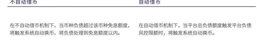自動借幣模式,來源:歐易OKEx;TokenInsight自動借幣模式下,如果賬戶的單一數字資產產生負債,系統會根據幣種的實際負債額進行利息收取,利息費用每八小時收取一次。如果用戶在結算之前償還負債,利息將不會被收取。當平臺總負債額度觸發平臺負債風控限額時,自動換幣規則將會把合約倉位產生的負債按大小進行排序,以此為順序執行自動換幣,償還超過負債額度的數字資產。