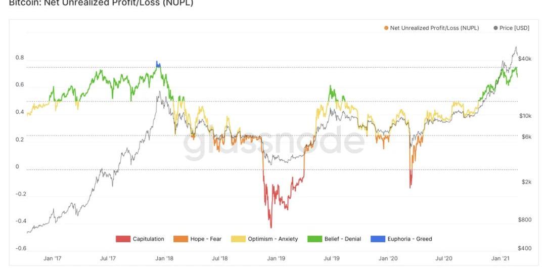 XRP/HKD+0.08%編者按:本文來自BlockVC,Odaily星球日報經授權轉載。美債利率超預期暴漲,引發全球金融市場跨資產巨震。在過去的半個月內,美國國債利率的大幅上漲引發了全球各個市場投資者的恐慌。利率是大類資產定價的錨,實際利率的提升導致風險資產遭到重創,比特幣及美股、A股等股市都在短時間內出現劇烈調整,高估值的利率敏感型資產跌幅尤其慘烈。從短期來看,市場出現急跌是超預期利率變化對于過于擁擠的交易頭寸和持續高筑的杠桿水平的大清洗,也是恐慌情緒的一種釋放。但從長期邏輯來看,市場正在達成并且交易一種新的共識——疫情牛結束了。我們在2020年的3月6日發布策略周報《減半、放水及比特幣長牛》,第一次提出了全球央行QE浪潮是新一輪財富轉移和再分配的起點,比特幣跨年行情演繹的邏輯從“減半預期牛”向“放水牛”。在短短的一周后,我們見證了經歷3·12的大清洗后,比特幣至今已經走出了長達一年的牛市,基本驗證了了跨年長牛的預判。隨著疫情牛的結束,長期放水和流動性催生的資產泡沫將出現更多的脆弱性和波動性,比特幣的疫情牛也該告一段落,這也標志著比特幣及數字貨幣市場的跨年長牛行情已經正式跨越中場,即將正式進入后半程主升浪階段,并向從“減半預期牛”到“放水牛”,再到真正的“減半牛”邏輯演繹。我們認為比特幣將在短期沖擊主升浪第一目標7萬美元一線。對于2021年2月底這場相對劇烈調整而言,即便是沒有利率的擾動影響,比特幣及數字貨幣市場自身也在醞釀著一次深度調整的需求。從波動率來看,市場進入2021年以來波動率持續降低,市場本身就在積蓄調整的力度。另外,從市場情緒來看,NetUnrealizedProfit/Loss(NUPL)顯示近期的上漲積累的豐厚的獲利盤,市場情緒進入短期樂觀情緒的峰值,擁擠的多頭倉位、持續累積的獲利盤和波動脆弱性受到美債利率的超預期調升的影響,引發了短期的劇烈調整。