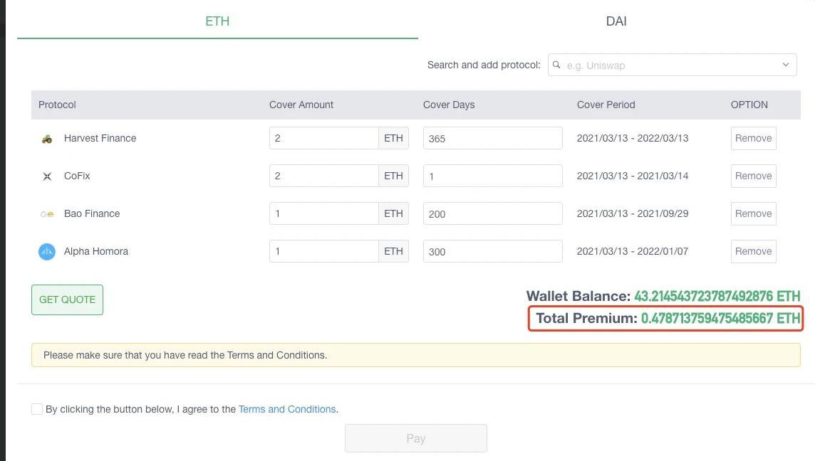 這是一個簡單的示意圖,大家可以區分出SCR和MCR的區別。在SCR之上的部分,freecapital,就是我們前面提到的,要拿去做投資的部分。船長:請問能參與保險的用戶有門檻么,會像NXM那樣有嚴格的KYC嗎?能向我們展示一下產品的demo,模擬一下用戶參保的流程嗎?Oliver:沒有KYC,我們認為Permissionless是DeFi的核心要義。我們的產品在www.insurace.io上可以直接使用。我簡單的給大家截圖看下。