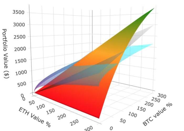 我們開始建模并設立了一些目標,總結起來就是:目標我想入場主流的加密貨幣-所以我想持有BTC和ETH作為開始。我喜歡在我睡覺的時候,我的錢能賺到更多的手續費的想法!-成為流動性提供者。我擔心它“全部歸零”--所以我想在我的貨幣對中有一個'穩定幣'能否可以幫助保護我免受這種情況的影響?模型該模型研究了流動性池中的Token對在各種不同行情下的負面和正面的行為。如果你在一個池子里,你提供流動性的一個或兩個幣都下跌或者上漲,這對你的費用有什么影響?對投資組合價值有什么影響?如果池子里有一半是穩定的,你是真的受到保護還是只無濟于事?我們想象,一個新的投資者可能希望同時持有BTC和ETH,也可能希望通過使用一個或多個穩定的幣來進行一些'對沖'。我們研究了其中一種或兩種Token的價值為零或3倍的極端情況,也研究了一種幣的價值上升而另一種幣的價值下降,甚至為零的情況。我們取了1000美元的假想金額,忽略了所有費用,總共有三個池子,分別是ETH/美元,BTC/美元以及BTC/ETH。進行這個分析而不是其他一些東西的另一個原因是,Uniswap上最大的兩個流動性池是ETH/穩定幣和BTC/ETH。注意事項我們忽略了一些流程的Gas費成本--這些可能是重要的--請您自己計算您的金額。這些成本可以而且確實改變了計算和結論,所以請在做任何事情之前檢查您的投資金額。我們假設穩定幣是100%穩定的。這顯然是錯誤的,因為它們在1美元附近波動。舉個例子,DAI在過去180天里一直漲到1.04美元,又跌到0.96美元,雖然這很罕見,而且只持續了很短的時間。因此,為了提供有意義的分析,我們假設我們例子中的所有穩定的Token都保持在1美元,無論如何。到目前為止,他們已經這樣做了,但監管干預或平臺失敗可能會改變這種情況。這同樣是一個模型,并不包括“真實世界的數據”,來自更多的時間/數據點,或包括許多其他瘋狂的Coin和交易對。我們假設在流通性提供者所獲得的年化收益率為22%,這可能會大大超過或不足,但必須有一些收益。你要自己研究,當然要記住,“過去的表現不一定能說明未來可能發生的事情”。此外,也忽略了在現實世界中的掉期、增持、減持等條件下賺取費用,以及這些條件下可能影響池子和定價行為的實時劇烈變化。假設“套利有效”,在主要Token的情況下,似乎是有效的。請記住,在其他Token中,它們可能不會在其他交易所上市,或者有足夠的流動性/交易量,這會導致很大的波動性。因此,“TLDR”是指在最小的池子中,無論是流動性還是交易量,這都沒有那么快或那么有效,這意味著與這些互動的人有很大的收益或損失。我們假設WBTC和BTC是完全一樣的東西。但是他們絕對不是,如果你關注這個問題,你應該自己做研究。所有這些都是假設Uniswap代碼在新版本發布或升級到ETH2.0時沒有任何變化發生。大多數的每日“行動”將在圖表的一個緊密區域,大約+/-50%,但隨著時間的推移,在特殊情況下,我們可能會達到圖表的不同極端。不同分析的結果1.只是持有ETH和BTC這可能是所有策略中最容易理解的,完全不涉及Uniswap,不過作為對照,我們還是引入了相對價格等概念。有三個軸可以參考;X是BTC的相對價值,Y是ETH的相對價值,Z是您投資的1000美元的價值。沒有真正的起點,但我們應該以100(%),100(%),1000美元為點,然后看看當Token價值相對于其他Token上升或下降時會發生什么。