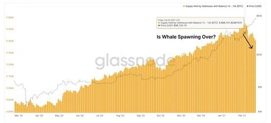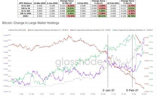 隨著價格繼續升值,較大的錢包中出現了一些變化的跡象,這些跡象可能會為潛在的市場動態提供一些見識。在確定這些代幣是購買、出售還是持有以及鏈上數據是否適合提供這種見解之前,必須先了解整體情況。自2020年3月以來,擁有1000至10000BTC的錢包一直處于強勁的上升趨勢,在20年3月12日至21年2月5日之間增長了14.18%。這被稱為“比特幣鯨魚產卵季節”,因為這些地址代表了數百萬至數億美元的資產。然而,在過去的兩周中,這種錢包階層似乎正在“減持”。這是新的賣壓嗎?機構是受到驚嚇還是獲利了結?下面的點、表格和圖表中介紹了一些有趣的鏈上事件,以幫助回答這個問題。