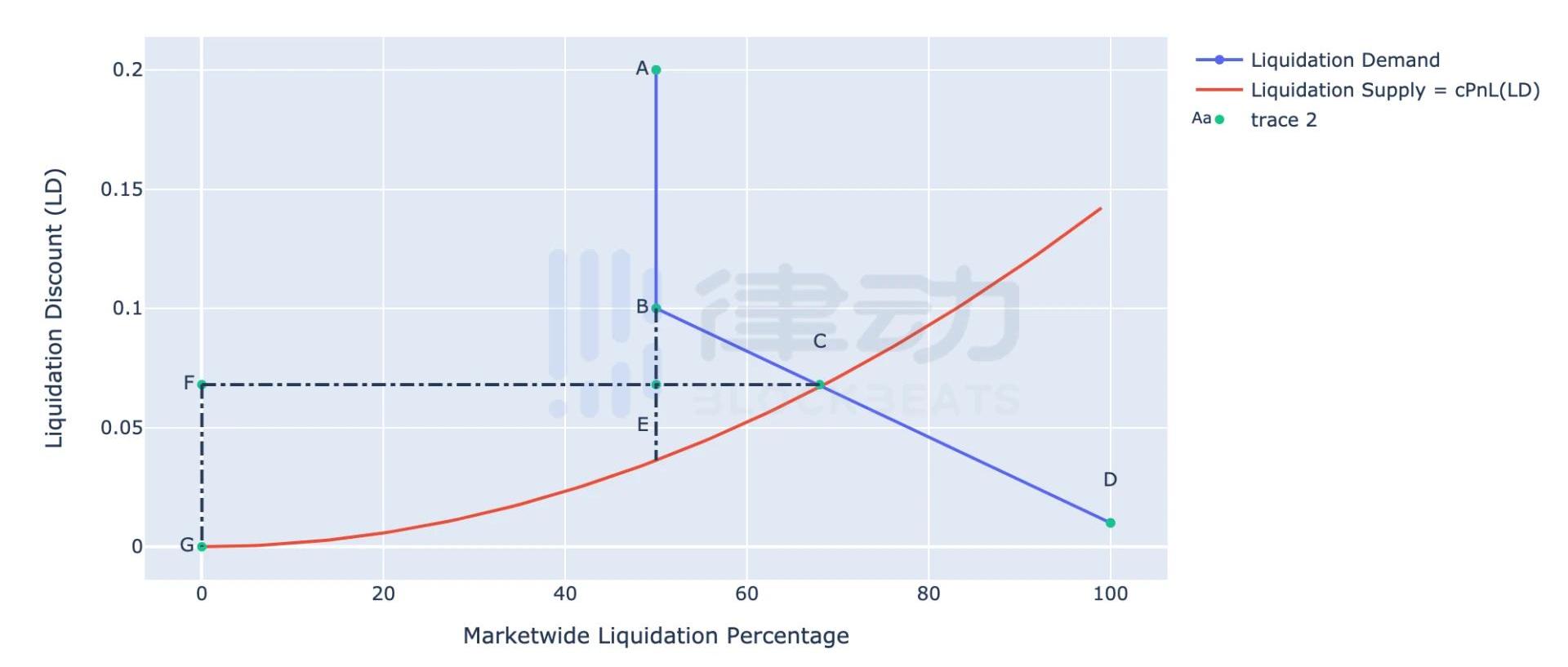 隨著時間的推移,我們應該預期市場力量會促使所有協議最終具有相同的有效清算折扣。從長遠來看,清算人選擇清算的時間/地點,將使各協議的清算折扣趨于平衡。最終,我們可以預期拍賣或可變Gas價格的有效清算比例將是相同的。利用前面概述的模型,我們可以考慮市場將如何選擇這個清算折扣。這里我們考慮一個理論市場,在這個市場中,所有的協議都可以以相同的規模和相同的資產進行即時清算。由于所有協議的規模和資產都是相同的,我們可以將清算供應簡單地建模為cPnL(LD),將清算需求建模為協議愿意為清算支付的最大金額。我們還假設50%的協議使用清算拍賣,50%的協議使用先到先得清算模型。利用這些假設,我們可以繪制出這個市場的供需動態圖: