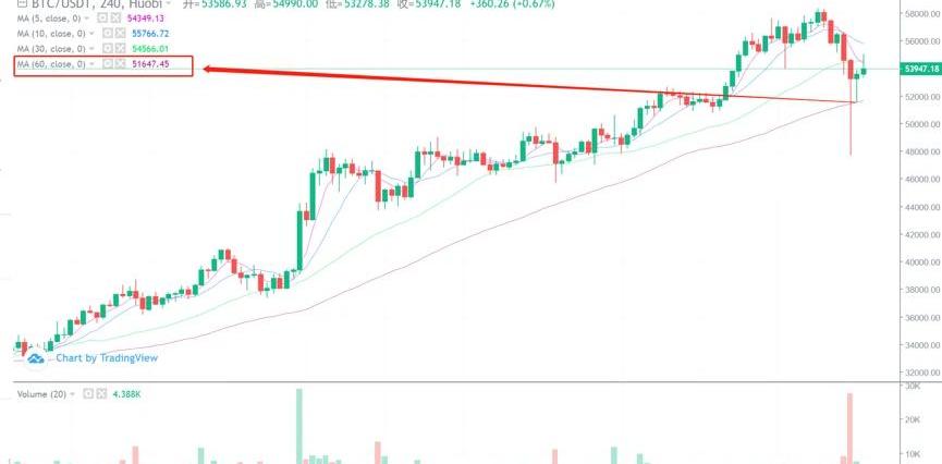 XRP/HKD-0.81%BTC行情分析昨日A股閃崩,創業板跌幅超過4%;美股昨夜黃金、白銀有色板塊大漲;納斯達克暴跌,科技股重挫,導致了BTC帶頭下跌,加密貨幣市場權限大幅度崩潰式回撤。BTC從55000,6個小時內從下跌到加速下跌放量跌至48000,市場回撤15%左右,但是龍頭的地位就是聰明者和錯失者是永遠不會放過任何一次下跌補倉的機會,每次閃崩都是倉位集中度提高的時候。今早BTC又重回55000的位置,4H周期回踩完成,繼續圍繞4H周期磨底,中樞區間明顯。