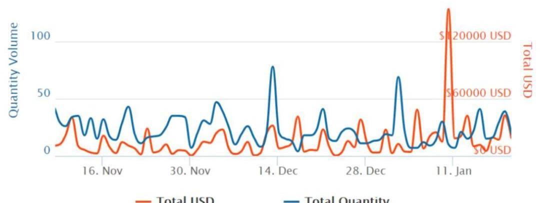 MANA/USDT4小時圖來源:TradingView2021年的第一周,MANA上漲了68%。除此之外,一些現實世界的創作者進入NFT行業的利好消息也為目前幣價反彈提供依據。例如,《瑞克與莫蒂》的創作者近期就以150,000美元的高價拍賣了他的一些NFT藝術品。根據Nomics的數據,在過去的30天里,MANA的透明交易量為3.68億美元,比上個月增長了257%,而近期,Decentraland市場的平均交易數量已經下降到每天20筆左右,70%的銷售是土地和虛擬財產。