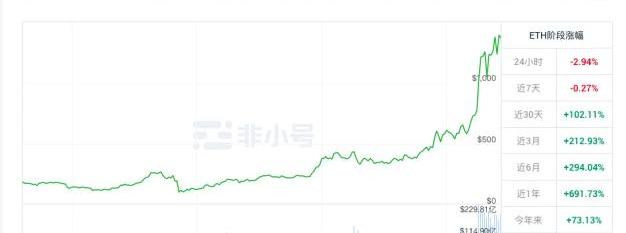 近期,加密資產市場多次經歷回撤。BTC在1月8日創下41950美元的歷史高點后,至今回落到32000美元上下,下跌幅度達到23.7%。而市值排名第二位的ETH則走出了獨立行情,1月25日,以太坊觸及1481美元,續刷了歷史新高,目前回撤至1300美元左右,回撤幅度為12%,僅為BTC回撤幅度的一半。在加密資產龍頭BTC下行期間,ETH可謂逆市上升,與BTC的流通市值差距也逐漸縮小。根據1月27日非小號的數據,ETH流通市值為1459.1億美元,約占BTC5819.9億美元市值的25%。而在本輪牛市啟動初期,BTC流通市值為1965億美元,ETH流通市值為398億美元,約占BTC總市值的20.2%。這表明,這輪牛市期間,ETH的上漲表現較BTC更為亮眼。尤其在近一個月里,ETH的表現明顯優于其他主流資產。非小號數據顯示,近一個月時間里,ETH漲幅達到102.1%,同期,BTC漲幅為21.79%,BCH為24.45%,LTC為-2.5%。