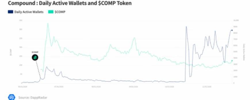 來源:DappRadar目前,NFT社區已經采用了流動性挖礦。Rarible是最早跟進的dapp之一,每周都會以RARI代幣的形式向賣家和買家發送獎勵。如下圖所示,自從RARI推出后,每日活躍錢包以及RARI代幣的價格都經歷了波動。