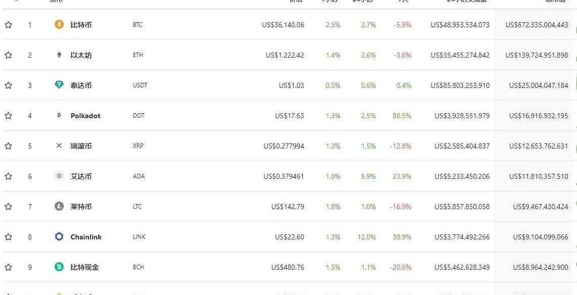 本周一,市值前10為:1、BTC2、EHT3、USDT4、DOT5、XRP6、ADA7、LTC8、LINK9、BCH10、BNB