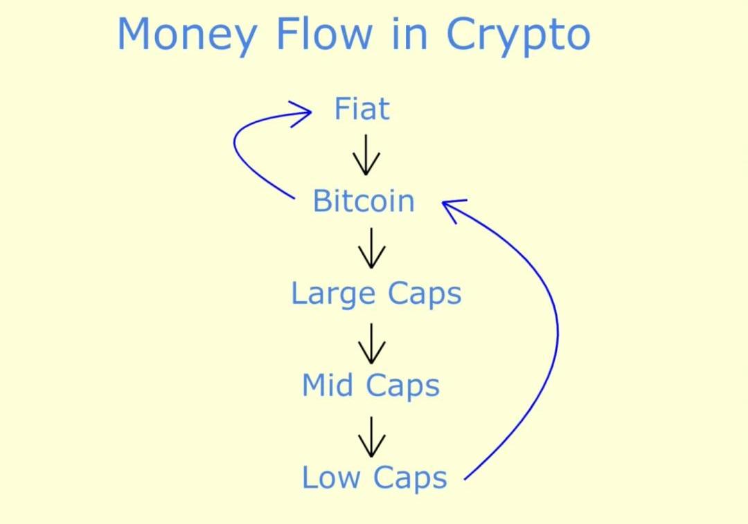加密貨幣也存在具有周期性的板塊輪動。從資金的流向來看,加密貨幣牛市分為四個階段。第一階段:比特幣暴漲。來自圈內以及圈外的資金流入,導致比特幣暴漲。隨后,資金慢慢流入以太坊,但難以跟上比特幣的步伐,直到拐點出現,以太坊上漲幅度,開始超越比特幣。第二階段:以太坊成為主角。在這個階段,以太坊的價格表現超過了比特幣,市場上開始有“以太坊長期價格表現將超越比特幣”的聲音。與此同時,資金開始慢慢流向主流幣,頭部TOP20的主流幣開始冒頭上漲。第三階段:主流幣上漲。以太坊表現優于比特幣,市值前50的加密貨幣開始猛漲。無論市值大小,一些基本面強勁的新型山寨幣開始成為市場的焦點。第四階段:山寨幣群魔亂舞。到了這個階段,不少優質藍籌幣持續突破新高。中市值、低市值、微市值的加密貨幣都在同一時間持續上漲,無論基本面如何,似乎每個幣都大漲,而藍籌幣的表現已經遠遠超過了比特幣和以太坊Meme無處不在,每個人都超級興奮,你會感覺到空氣中的狂熱。山寨季之后呢?一般而言,山寨季之后,資金會有兩種動向。第一,盈利套現,變成法幣。當投資者在山寨幣的狂歡獲得幾倍甚至幾十倍的回報,獲利者會直接變現為法幣,大規模的套現勢必導致整個加密貨幣市場出現調整,甚至是山寨季徹底退場,加密貨幣市場轉而進入熊市。第二,山寨幣獲利資金回流到比特幣。這將重新激活比特幣的勢能,比特幣繼續上漲,開始新一輪的“牛市周期”,資金會再次向下滾動,回流到以太坊、主流幣、山寨幣,緩慢開啟第二輪牛市。