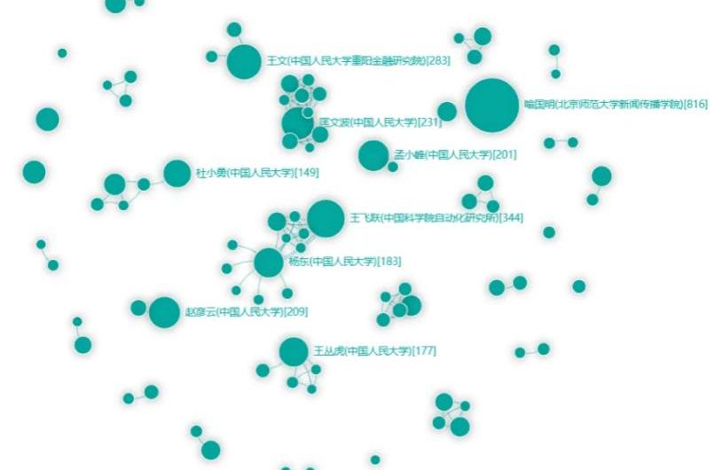 圖源:01區塊鏈根據中國知網數據制作從重要學者角度來看,中國人民大學與喻國明、王飛躍有較多合作,中國人民大學區塊鏈研究院執行院長楊東在區塊鏈數據治理、區塊鏈監管等方面取得了較好的學術成果,王文、匡文波、孟小峰、王叢虎等學者也較為活躍。中國人民大學國家發展研究院金融科技與互聯網安全研究中心、國際貨幣研究所、金融科技研究所、重陽金融研究院等多個附設科研機構的相關學者也有多篇產出。圖3-10:中國人民大學在區塊鏈相關研究的作者合作網絡