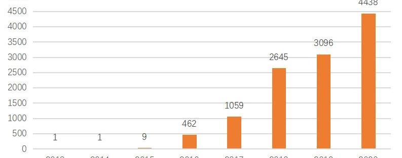 在中國知網的學術期刊庫中檢索“區塊鏈”關鍵詞,可以檢索到20600余篇。根據中國知網提供的統計工具,可以看到:從2016年起,區塊鏈相關文章開始明顯增多,同時每年文章發布的數量逐年上升,反映出國際上對區塊鏈的研究熱度在2016年后急速攀升,且至今熱度不減。圖2-1:每年新增區塊鏈相關期刊文章數