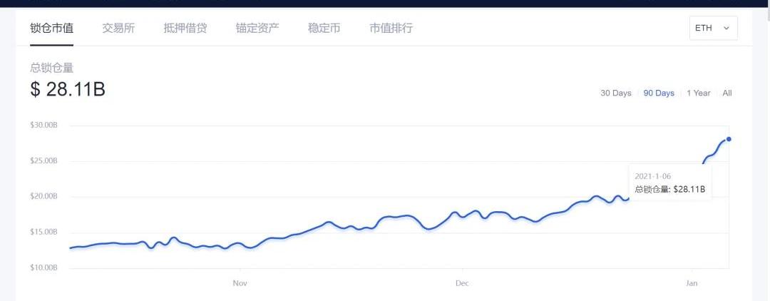 1月4日,以太坊鏈上的交易手續費達到了22730ETH,是以太坊有史以來的第四高位。同期以太坊挖礦的區塊獎勵約合12992ETH,手續費為礦工帶來的收入是區塊獎勵的1.75倍。1月6日,以太坊上DeFi協議總鎖倉量突破前高,達到了281.1億美元。