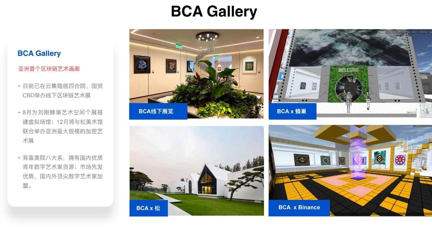 上面這個作品,在整個加密藝術史上都非常有代表性,叫FirstSupper,去年年初被拍賣到一百多個以太坊。這個作品在我看來,是目前最具有區塊鏈語言或者是加密藝術語言性的作品。它是由13位美國加密藝術家共同協作創造的。畫面上每個元素,都可以通過以太坊在鏈上購買,所以這個作品是永恒在變的。它可以與收藏家或者是觀看者進行一些互動,我們所有的互動都是在鏈上通過合約代碼等方式存在的。因此,無論是在藝術史上,還是在加密的區塊鏈的歷史上,這個作品絕對是具有革命性的。我們所有人可能都在想的一個問題,現在購買加密藝術品或者收藏NFT,我們最終要在哪里欣賞這些作品?我認為不光是在錢包里看,可能我們還需要一個看得見摸得著的實體,那就是屏幕。我跟中央美術學院數字藝術學院的主任,深入探討過這個話題。我們認為,未來五到十年內屏幕的價格會像布料一樣便宜。在那個時代,我們所有人穿的衣服、墻面,都會是屏幕,無論是靜態的LED,柔性屏、可彎曲屏幕等等。這些屏幕需要填充的內容,就是我們現在的NFT。因此,這個產業將來的市值絕對是萬億級的。前幾年我做演講的時候,就說這個市場會是千億、萬億,當時心里還有點虛,因為國內熱點大家來去都很快,但現在這句話,我覺得一點都不虛。因為真的是可以看到,伴隨區塊鏈、時代和科技的趨勢,這個市場的未來真的前景廣闊。2.BCA是什么?