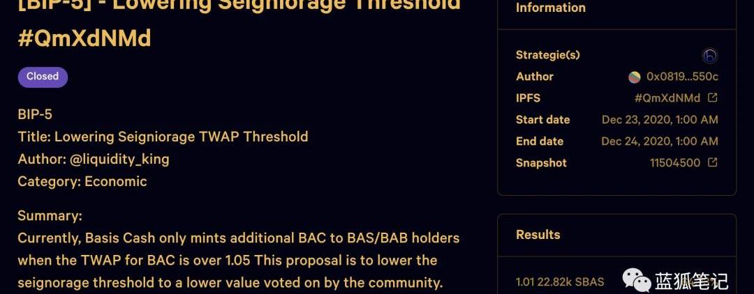 *動態的鑄幣門檻根據Basis的社區提案BIP-5的提議,Basis會實施動態鑄幣門檻,預期的初始鑄幣價格將會從當前的1.05降至1.037,這意味著未來BAC的TWAP價格超過1.037之后,就會生成BAC用以激勵BAB和BAS的持有人。