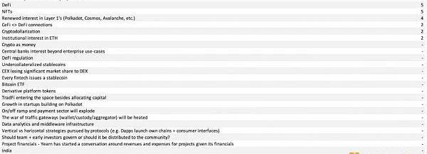 總結BlockResearch2021年投資者調查的調查對象共計41名數字資產投資者(投資者、交易員、基金分析師等),目的是預測2021年的市場預期大概情況。該調查涉及一系列多項選擇問題,問題選項能夠反映出受訪者的信心,例如,BTC價格會在未來創新高嗎?選項有:強烈否定、否定、中立、同意以及強烈同意,受訪者甚至可以寫下自己的看法。以下都是調查結果的整合,其中有幾個有趣的結論值得大家注意:展現出最強信心的問題:在眾多問題中,受訪者對穩定幣供應增長最有信心,他們相信增長速度同比增長330%,2021年美國將會通過一只BTCETF。DeFi及對以太坊升級的展望仍會是業內最值得探討的話題:根據BlockResearch2021年投資者調查,在“2021年前最受低估事件”列表中,DeFi位列第二,ETH2.0layer2擴展應用排名第一,這與TheBlock展望2020年調查結果一致。受訪者認為2021年NFT會是更加熱門的話題。諷刺的是,NFT、DeFi及ETH2.0分別在2021年前關注度過高的事件中排名前三。這顯示了投資者對與以太坊生態系統的看法還是有很大分歧。業內最有影響力的公司就“業內最有影響力的公司”這一問題,在受訪者寫下的31個回答中,出現頻率最高的公司是Coinbase,有55%的受訪者提及這家公司,這完全在意料之中。25%的人提到了BlockFi和Square,然而在前5個最多人提到的公司中沒有Uniswap。投資者認為2021年數家標準普爾500企業會在資產負債表中持有BTC追蹤BTC價格的股票指數會變得觸手可及嗎?今年,Square和MicroStrategy都在公司資產負債表中持有了BTC。但兩家公司都不是標準普爾500企業。有趣的是,超過50%的受訪者認為在標準普爾500企業中,有5-9家會在2021年的資產負債表中持有BTC。