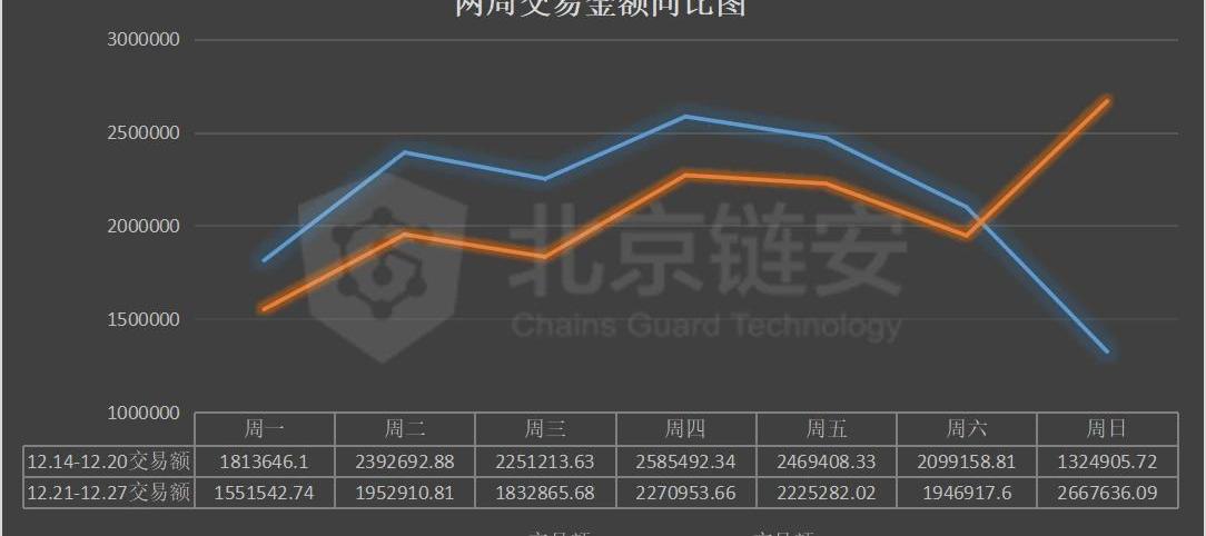 大額轉賬數:12.14-12.20:980412.21-12.27:8680較之前一周下降:11.46%詳細數據圖如下: