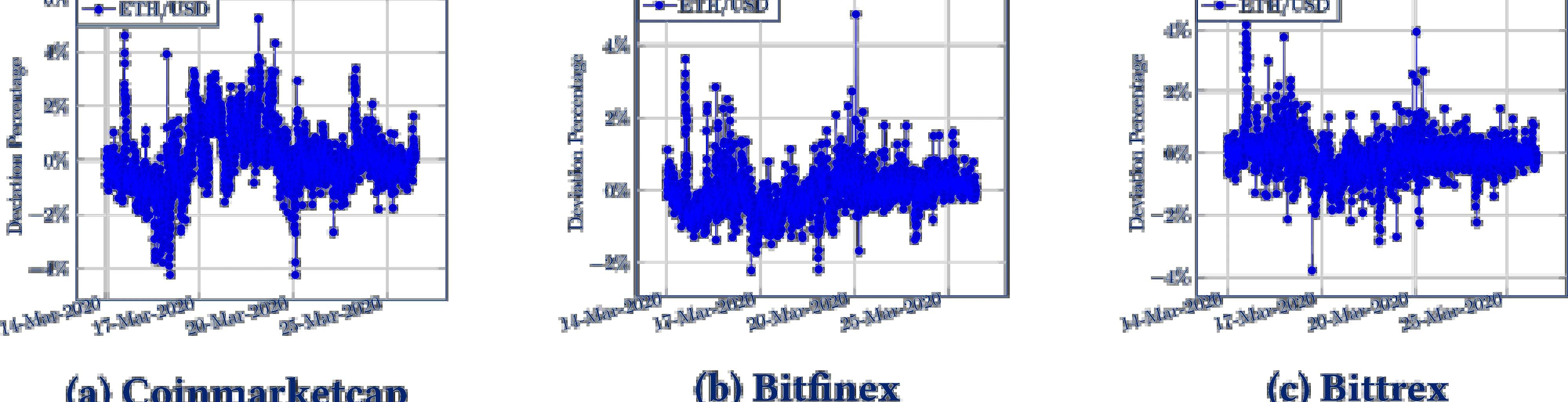 其中是每個數據點的百分比,N是數據點的總和。在大多數情況下,由于加密資產的波動性,平均偏差低于2%,可以看作報價信息相對準確。從圖11a到圖11c,我們可以看到從原始數據到60分鐘中位數數據的過程中平均偏差在增加。在Synthetix中,Bittrex相對于Coinmarketcap和Bitfinex是更精確的數據源。在MakerDAO中,Bitfinex的實時價格更準確,而Coinmarketcap的10分鐘和60分鐘中位數更好。對于Compound,可以觀察到CoinbasePro比Kraken更準確。此外,AmpleForth預言機的結果呈現其他三個平臺相反的趨勢,這很可能是由于該平臺預言機在向聚合器報告之前處理了較長時間的平均價格。