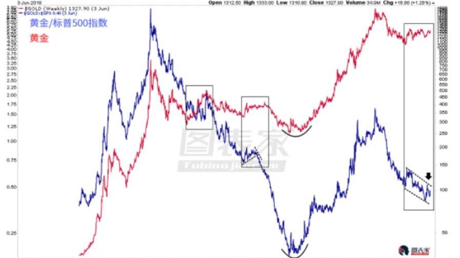 Source:IncrementumAG上圖是個很有意思的圖,當比值不斷走低時往往發生的是泡沫經濟,可以看到從2010年至今比值一直在走低,未來泡沫什么時候破滅我們不得而知,有可能是一次美聯儲的誤判,或者中東爆發的戰爭等,但我們知道的是美聯儲的工具箱,財政空間都所剩無幾,因此可以預測美聯儲不敢前瞻預判,更多的是保守,等數據出來或者事件發生才可能做出改變。這又是利好金融資產。如果泡沫破滅,可能的導火線是中東爆發戰爭,爆發戰爭石油大幅度上行,通脹預期大幅走高,名義利率預期走高,投資者風險偏好開始大幅減弱,提前拋售金融資產,流動性緊張,債務杠桿破裂,最后整個泡沫破裂。這時看美聯儲的行動時間,什么時候繼續MMT來填補債務。當下黃金走強的并不完全是避險屬性的推動,更多的是因為2018年名義利率大幅下降,導致的實際利率快速下降而導致的金融需求推動的資產價格上漲。如下圖是黃金價格與標普500指數的比。