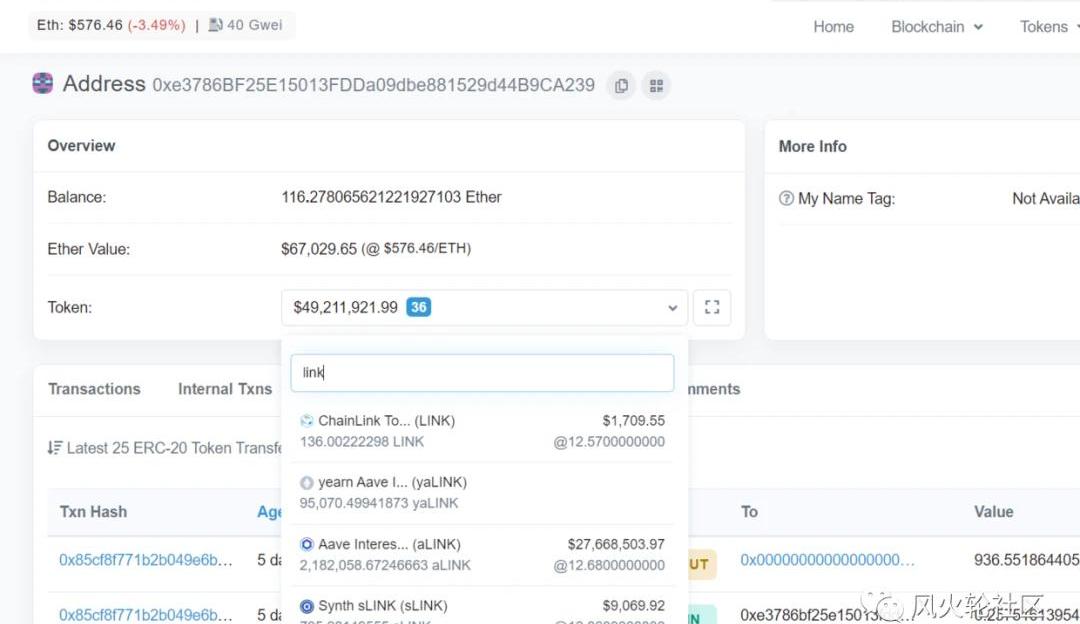 要爆倉的話需要eth/link/aave在現價基礎上腰斬再腰斬。不過故事到這里還沒完哈,重點來了,我們需要的不僅是了解這些大戶的杠桿率,更需要了解的是魯迅沒有告訴我們的那個問題,這么多錢是從哪來的,特別是抵押了價值數千萬的link和aave是從哪里來的。我們再重新回到以太瀏覽器,查詢該地址里原link代幣的記錄: