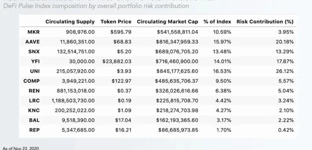 此外,DPI總風險的77%主要由4種代幣驅動,DPI指數的收益會由于這4種代幣的價格波動而變得極為敏感。與我們的60/40投資組合一樣,DeFiPulseIndex組合中的少量資產帶來了大量風險。
