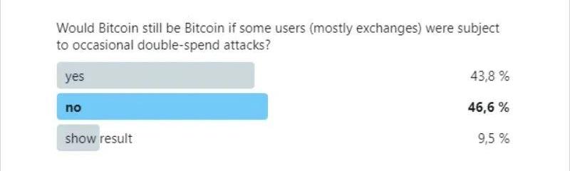 大約有一半的受訪者拒絕接受雙重支付,這在一個重視產權高于其他的制度中是有意義的。但如果我們仔細想想,雙重支付基本上就像拒付支票或撤銷信用卡交易。一些人撤銷信用卡交易的事實是否會使它成為一個無用的系統,尤其是考慮到用戶本身基本上永遠不會成為這個系統的受害者,而只有交易所和大商家會?也許同樣的邏輯也適用于這里,我們在審查抵制背景下所討論的問題,不過與信用卡不同的是,比特幣交易的目的是“最終確定”,因此任何違反都更像是對整個系統的攻擊。盡管如此,另外一半的受訪者仍會繼續使用比特幣,即使偶爾出現雙重支付,我認為這是一種更健康的態度。如果比特幣用戶希望在這種攻擊中獲得絕對的安全,那么這就意味著:相對于接受偶爾雙重支付的比特幣,他們將不得不在安全上花費更多的錢。根據區塊空間市場的發展情況,這種觀點最終可能會與“無通脹”觀點發生沖突,在這種情況下,其中一個將會失敗,可能會出現社區分裂。如果我們想要防止這種情況發生,那么放松你的標準來支持“較小的邪惡”有時會有很大的幫助。用戶需要準備通過社會協調拒絕更多的重整。要想有效地做到這一點,就需要程序和等級制度的到位,而這些程序和等級制度會降低系統的社會可擴展性。總之,我認為用戶對快速可靠的解決方案的偏好和他們對貨幣不通脹的偏好是最可能發生沖突的。手段與目標