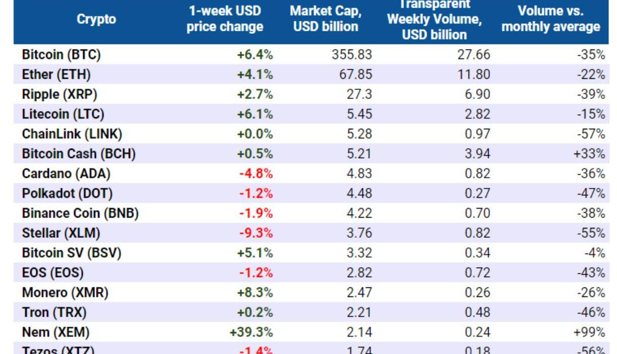 每周前16位加密貨幣表現來源:Nomics&CoinMarketCap上圖顯示了本周比特幣如何獲得市場份額。除Nem外,其余山寨幣上漲0.5%。總體而言,交易量令人失望,盡管部分原因是比特幣徘徊在19200美元。每當交易者猶豫不決時,他們就會減少頭寸,等待更好的進場點。因此,本周的交易量下降是一種調整,而不是缺乏興趣。比特幣價格盤整時,機構投資者積累比特幣