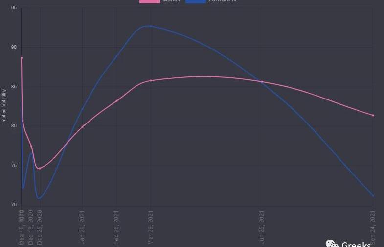 ETH歷史波動率10d91%30d90%90d74%1Y103%以太坊今日期權持倉量7.09億美元,成交量0.47億美元,以太坊持倉量穩定。各標準化期限IV:今日:1m75%,3m84%,6m86%12/8:1m73%,3m83%,6m90%以太坊的短期IV明顯低于中遠期,現在差價大約是10%的IV,恢復到以太坊幾個月前的水平。