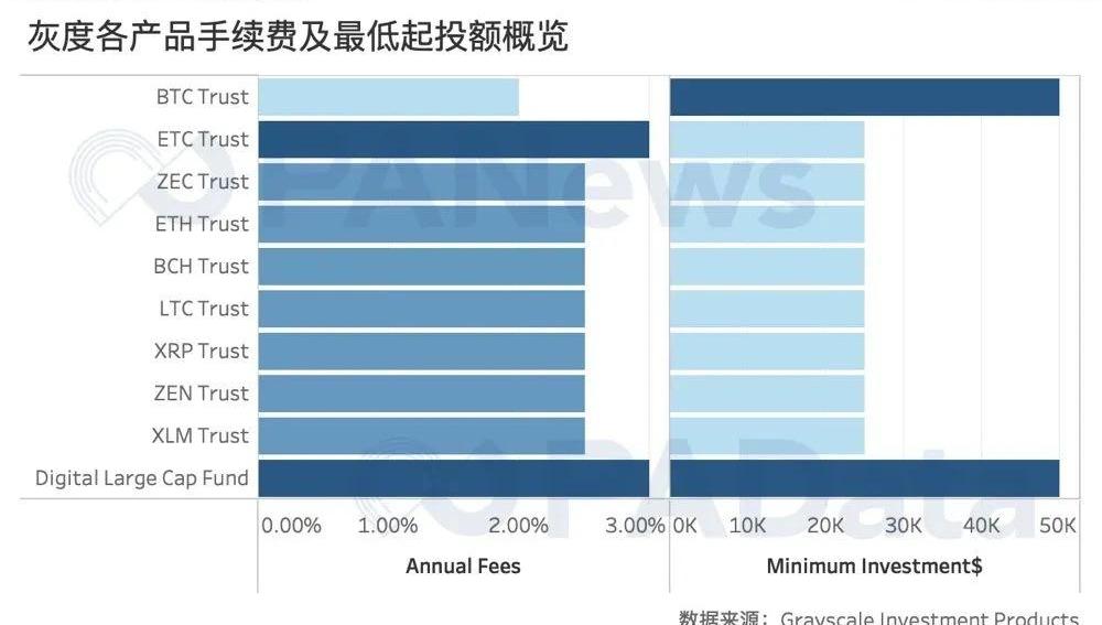 從起投門檻來看,除了BTCTrust和DigitalLargeCapFund要求5萬美元以上以外,其他8種投資產品的最低投資額度都是2.5萬美元。灰度通過收取幣本位管理費來獲得收益。目前,BTCTrust的年管理費為2%,ETCTrust和DigitalLargeCapFund的年管理費為3%,其他產品的年管理費為2.5%。這些管理費將直接從投資者的數字貨幣份額中扣除。