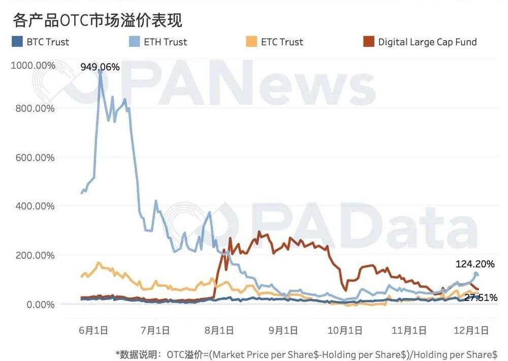 由于灰度設定了不可贖回的信托模式,因此投資者想要出金獲利只能通過在美股二級市場中交易份額的途徑來實現。灰度目前有6種產品的份額可在二級市場交易,包括GBTC、BCHG、ETHE、ETCG、LECN和GDLC。PAData計算了每份份額價格和場外交易價格之間的溢價率,根據統計,除了ETCTrust的份額溢價短暫低于0以外,其他各投資產品的溢價空間都較大。其中BTCTrust的份額溢價是目前所有產品中溢價最低的,約為27.61%,最近半年的平均溢價約為17.17%。ETHTrust今年的溢價較高,目前的溢價約為124.20%,年中一度高達至949.06%,全年平均溢價率高達208.81%。多元資產基金DigitalLargeCapFund今年的溢價表現也不錯,目前約為61.22%,8月至10月期間一度高于200%,全年平均溢價率也達到了110.64%。