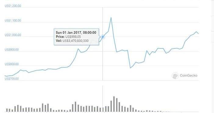 上圖是2013年年底比特幣達到人生中第一個1000美金大關,然后看1000美金的這根橫亙的線,等到2017年1月1日幣價達到998美金,再次觸碰1000美金。如下圖: