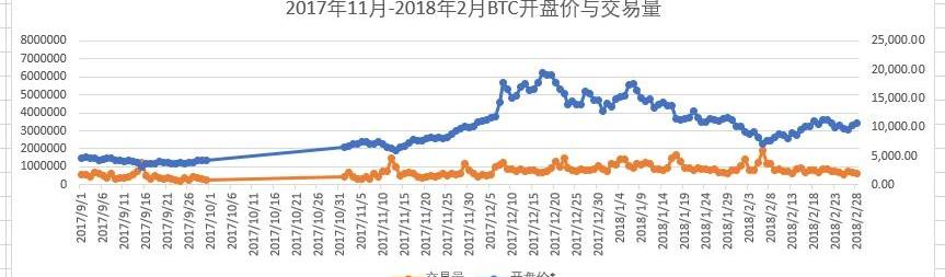 圖6這一部分的散點分布是BTC價格在上漲,但是交易量越沒有太多增長的點。這說明,在2019-2020年,市場變得非常理性和謹慎。價格與交易量比較在excel里,制作開盤價和交易量的折線圖,左側主坐標是交易量,右側次坐標是開盤價。excel會自動生成坐標,小蜜蜂分別把2017年牛市高峰,也就是2017年11月-2018年2月的數據,以及現在階段,也就是2020年10月至今的數據,坐成兩個折線圖。當然,把兩個圖的坐標統一了,得到以下兩個圖: