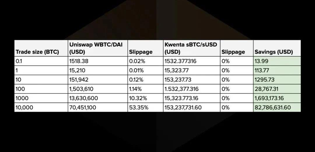 很容易看出,持續交易即使是較小的交易,相比于領先的DEX—Uniswap中最受歡迎的代幣ETH和BTC而言,Kwenta都可以節省大量資金。節省金額
