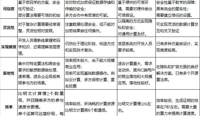 上表的前3種方案解決更多的是基于交易的匿名性,難以做到良好的安全性和百分百的匿名性。在隱私計算上,基于密碼學層面的技術有全同態加密,多方安全計算、零知識證明三種;基于硬件設計的方案主要有可信執行環境等技術。多方安全計算MPC的安全性和可信度基于密碼學,安全可驗證,其落地性主要集中于小場景,對于特定算法和高安全要求的敏感數據做處理。但其計算靈活性受限,隨著參與方人數的增加計算效率會進一步減慢,在實際應用中存在通訊負擔的問題。目前的多方安全計算單個運算可以達到毫秒級,但在大數據場景下,一個數據應用或模型訓練涉及到上萬的數據樣本,運算效率和通訊負擔是阻礙MPC發展的瓶頸。而且對于需要執行復雜計算任務的應用場景,MPC目前還難以勝任,尚需要幾年的時間優化。全同態加密目前仍基于理論階段,在可信度和靈活性,效率等各方面都相對較落后,實際運用時效率太低,構造方式和實現技術復雜,尚不能大規模商業應用。現有FHE方案主要通過同態解密技術來降低密文膨脹問題,這樣確實從理論上看能夠克服計算邊界的問題,但從實現角度上看非常復雜。此外,安全性與適用性問題也必須加以考慮,目前大部分同態加密算法無法有效抵抗自適應選擇密文的攻擊,最高安全級別只能達到抵抗選擇明文攻擊。可信執行環境TEE實際上已大規模應用,例如手機上的指紋解鎖,生物識別等。TEE基于可信硬件設施,在安全性上依賴硬件的可信環境和中心化的硬件廠商,需要對硬件做出可信假設,可能面臨側信道攻擊。其優勢在于靈活性較高,對通用計算較友好,速率較快。技術搭建相對成熟,相比于其他隱私計算方案,TEE的綜合實力是最接近實用場景的。零知識證明是可信度最高的,可以實現完全的匿名性,但部分協議也需要進行可信設置,依賴特殊隨機數的生成。可實現靈活的數據計算交互和交叉驗證,但實現難度仍然較高,目前能夠生成證明的效率在7秒左右,需要大量的算力來提高計算速率。下表為4種隱私加密技術的細節對比: