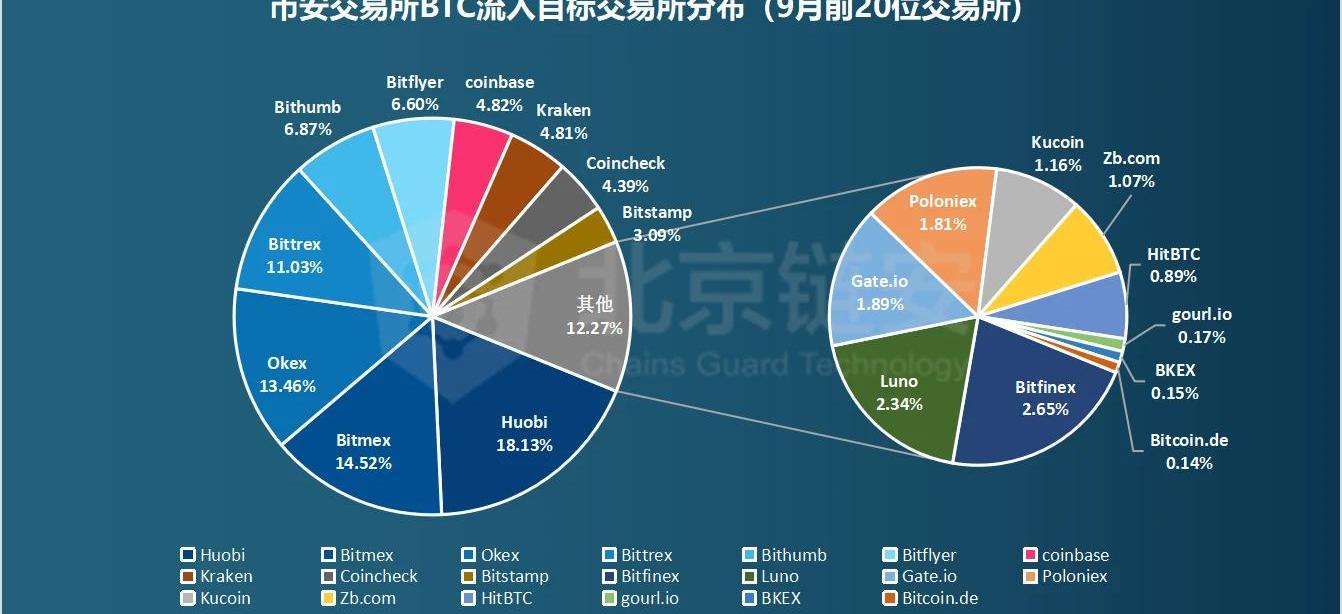 再看看幣安的比特幣流入來源,就10月15日到11月15日這一個月的數據來看,很明顯的看到來自于火幣的比特幣流入占比達到了47.75%,共計有55819.9BTC流入到幣安,這是什么概念呢?我們對比一下9月的數據。
