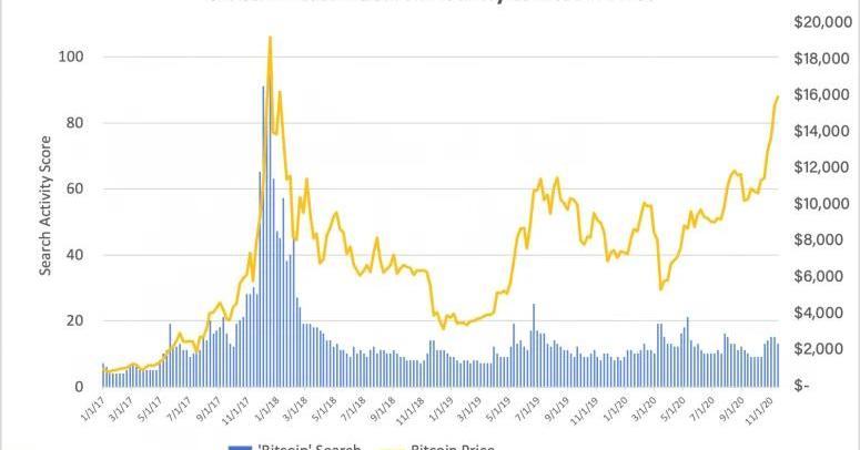 對比特幣來說,這是巨大的一周,目前比特幣的價格已經逼近2017年創下的歷史高點,市值也已經超過了那個時期的高點。但在一個非常重要的方面,這次的漲勢與三年前的漲勢完全不同。相對來說,"FOMO"人群,也就是那些不想錯過別人大賺特賺的散戶,已經相對缺席了。而下圖則很好地體現了這一點。與2017年不同的是,圍繞"比特幣"一詞的谷歌搜索活動--這是普通民眾好奇心的代表--幾乎沒有從過去幾年的水平上有所動搖,即使價格暴漲。
