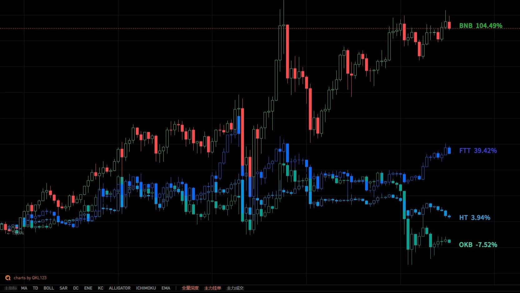 來源:QKL123上圖為USDT在第三季度的流通供應量情況以及BTC的走勢,BTC走勢整體呈現一個“拱形”,可看出BTC在高位震蕩時,USDT流動供應量增幅相對較大;BTC在相對低位震蕩時,USDT流通供應量增幅較緩。從另一個角度來說,USDT流通供應量增量幅度和BTC價格呈現一種正相關關系。2.3平臺幣生態