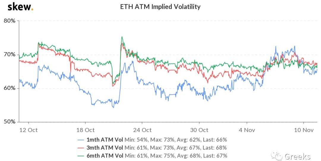 ETH歷史波動率10d80%30d63%90d82%1Y103%以太坊今日期權持倉量5.61億美元,成交量6000萬美元,以太坊持倉量穩定增長。各標準化期限IV:今日:1m65%,3m67%,6m67%11/11:1m65%,3m67%,6m67%