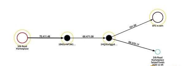 據訴訟文件所述,2020年執法人員利用第三方比特幣情報公司分析絲綢之路處理的比特幣交易時發現,有54筆交易被從絲綢之路控制的比特幣地址發送到兩個比特幣地址:1BADznNF3W1gi47R65MQs754KB7zTaGuYZ和1BBqjKsYuLEUE9Y5WzdbzCtYzCiQgHqtPN,共計70411.46BTC。這些轉賬中每筆轉賬金額為整數比特幣,轉帳時間有規律。例如,有10筆轉賬發生在凌晨3點59分左右,每次轉賬金額正好是2500個比特幣。這種轉賬模式和額度不是典型的絲綢之路用戶。因為"絲綢之路"的轉賬金額大多低于100比特幣。這54筆交易不是絲綢之路商家或員工的轉賬,因此代表著有神秘黑客從絲綢之路盜取比特幣。2013年4月9日左右,收到70411.46枚比特幣的比特幣地址從絲綢之路向1HQ3Go3ggs8pFnXuHVHRytPCq5fGG8Hbhx轉移69471.082201枚BTC(時值約1400萬元美元)。2015年4月23日,1HQ3發送了101個比特幣給BTC-e。BTC-e是一家提供比特幣相關服務的無牌運營的加密貨幣交易所。2017年1月BTC-e和BTC-e的一名俄羅斯運營商因經營無證匯款業務和洗錢在加利福尼亞州北區檢察院被起訴。Chainalysis分析的BTC流向圖如下: