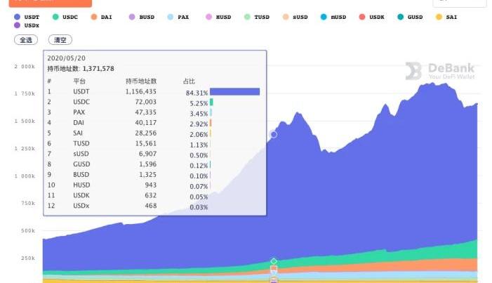 目前市場中的穩定幣主要可以通過發行機構及應用場景分為三類,第一種是中心化機構發行的穩定幣,以USDT,USDC,PAX為首,第二種為中心化交易所發行的穩定幣,代表的有火幣HUSD、幣安BUSD以及USDK等,第三種是以去中心化金融DeFi以錨定機制發行的穩定幣,代表的有Dai、USDX等,三種類型因其出身不同,則應用場景與方向已然不同。中心化機構及中心化交易所所發行的穩定幣市場應用較為相似,依托交易所巨大的資產入口發展,并在交易所生態中扮演交易對及避險貨幣的重要作用,交易所發行的穩定幣目標在于利用自身交易所方的優勢,搶奪USDT所占領的穩定幣市場,利用自身穩定幣與其他幣種兌換,一方面方便客戶出入金及充提幣操作,一方面向自身發行的穩定幣導流占據市場。中心化機構發行的穩定幣則以嚴格的財務審計作為自身優勢,但USDT的多次超發與涉嫌操縱BTC市場導致中心化機構的穩定幣機制深受外界質疑。去中心化金融DeFi下的穩定幣MakerDAO是建立在以太坊上的DeFi項目,允許加密貨幣的持有者申請超額抵押貸款,這些貸款以DAI的形式支付,DAI是一種去中心化的穩定幣,通過貨幣政策杠桿與1美元的價值掛鉤,用戶可以通過存入協議所接收的加密貨幣來生成DAI。通過用戶角度來講,MakerDAO通過智能合約來質押用戶的數字資產ETH,再借給用戶同等金額的穩定幣Dai自由使用。與中心化機構發行的穩定幣最大的區別便是,Dai的整體運行機制完全公開透明,不僅Dai本身透明,換取Dai的ETH數量也同樣對外透明可見,更重要的是Dai始終超額抵押,利用風險保護與套利清算機制對擔保物進行抵扣,使Dai備用始終有足額資產擔保,以使Dai無論市場波動如何劇烈始終擁有足夠的兌付性。但由于Dai是建立在以太坊上的DeFi項目,ERC20種只有ETH有足夠的流通以應用可作為抵押物,整體市場范圍受限,導致DAI的總發行量始終未突破10億美元關口。Kave是基于Cosmos生態的多資產DeFi平臺,同時Kava是一條單獨的公鏈,這和基于以太坊的Maker有很大不同,Cosmos獨特的跨鏈特性,讓同生態間的公鏈能夠比較容易的實現跨鏈互通。USDX采用了彈性供給機制,正常情況下USDX的供應量是和抵押資產價值以及抵押率掛鉤的,但是如果出現清算或債務拍賣的情況,系統相應地擴展USDX的供應來達到超額抵押的平衡狀態。Kave相對于Maker最重要的優勢便在于DAI只能通過ETH抵押產生,當以太坊價格走低則降低DAI的供應量,受到較強的市場局限性,而Kave的邏輯可以通過抵押USDC、PAX、DAI等生成USDX,同時可以通過介意將USDX兌換成其他穩定幣,極強的增加了跨欄市場的流通性。以下則是目前前十穩定幣的市場數據: