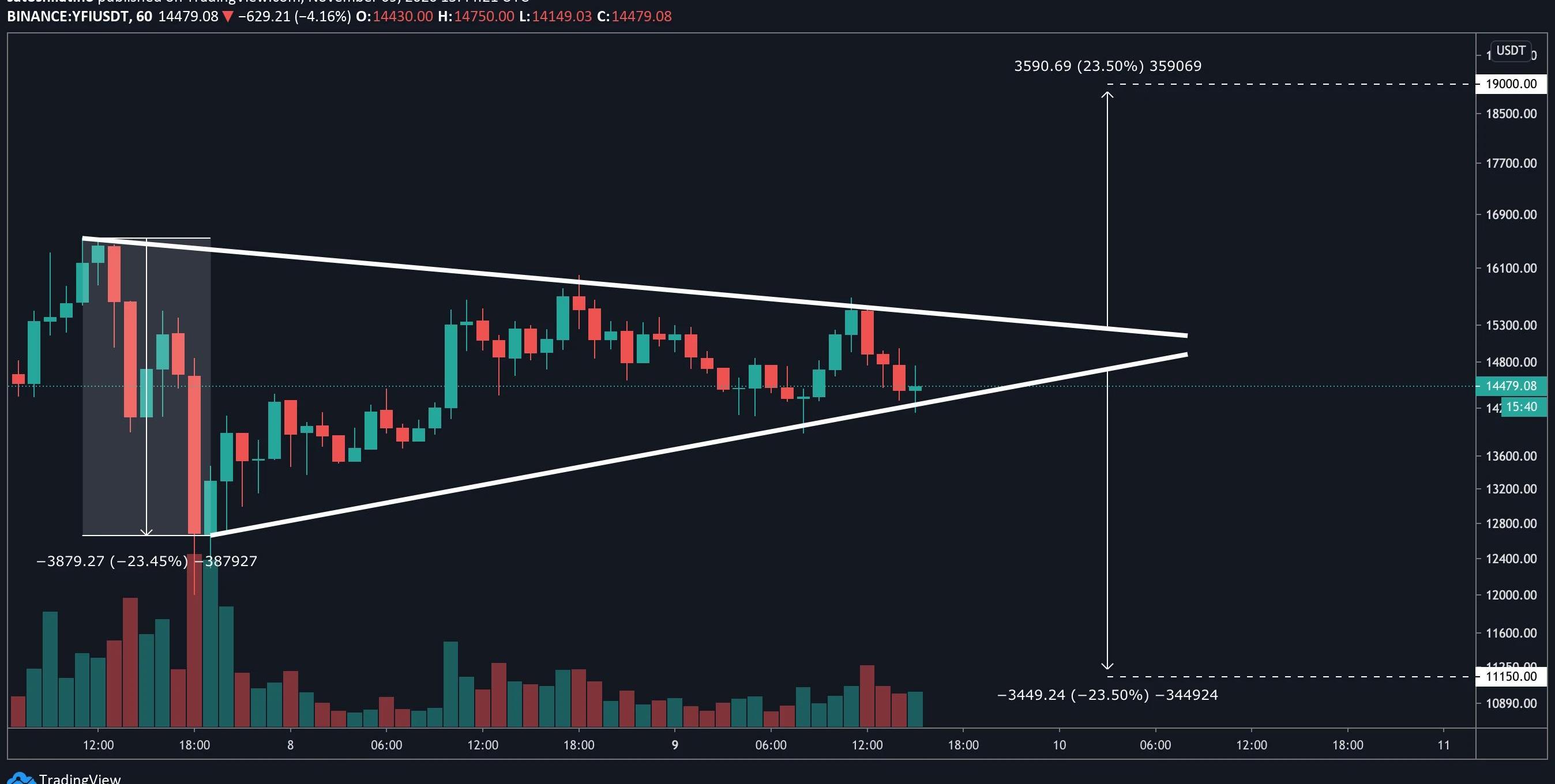 yEarnFinance在最近幾天飆升了近143%之后,似乎已進入合并期。停滯的價格走勢似乎導致其小時圖內形成對稱的三角形。下降趨勢線與擺動高點一起形成,而上升趨勢線與擺動低點一起形成。通過測量走勢圖的初始高點和低點之間的距離并將其添加到突破點,對稱三角形建議目標為23.5%。這種加密貨幣背后的購買壓力增加可能使其交易價格約為19,000美元。
