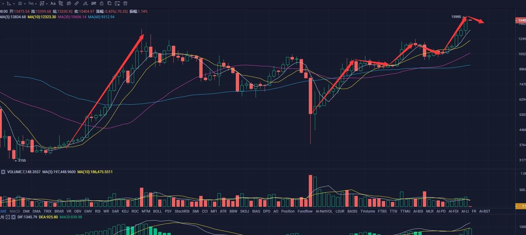 前七大中心化交易所中包括Coinbase、Bitfinex以及Gate.io等國外頂尖交易所,也包括了幣安、火幣這樣國內投資者耳熟能詳的交易所,這一數據更能說明我們的判斷。幣安和火幣以及kucoin等交易所有兩個特點,一是以國內用戶為主,二是以山寨幣和合約交易為主,而擁有該兩個特點的交易所交易量大幅下滑,說明10月份以比特幣為主的交易國內投資者并沒有太多的參與,甚至沒有怎么反應過來,大多只是盯著或持有沒有什么波動的山寨幣,減少了交易量。另外,由于10月份OKEX停止提幣的事件,對另外兩大國內交易所影響也較大,所以減少了交易量也屬正常。而在幣安和火幣交易量下滑78%的情況下,前7大交易所交易量下滑了32%,說明部分國外的交易所交易量是在上漲的,將幣安和火幣下滑的交易量拉了上來才有32%的中和數字,只是上漲的交易量無法完全掩蓋國內交易所下滑的交易量罷了。同時也說明,10月份購買比特幣的渠道主要是通過國外交易所,以國外投資者為主。如此一來,又回到了當前山寨幣投資的現實問題,這一波比特幣上漲行情中,國內幣圈根本沒有什么增量資金。回顧2017年大牛市,比特幣以太坊上漲的那么厲害,引得圈外資金紛紛內流,而圈外資金不僅是流到比特幣、ETH這些幣種中,還催生了山寨幣牛市。當前的情況時,比特幣有資金在推高,主要以國外機構資金為主,而以國內散戶資金為主的山寨幣沒有什么反應,只有幣圈原有的資金手里握著山寨幣的籌碼,還期待著山寨幣能效仿2017年,等比特幣滯漲后,資金能光臨山寨幣。不能說完全沒有機會,但這個機會很有可能是陷阱,如山寨幣幣種中的莊家故意在比特幣滯漲時拉高盤面,造成山寨幣上漲的錯覺,由此一來,市面上也會出現該輪到山寨幣發威的聲音,進而吸引籌碼,但關鍵是這個吸引進來的資金能持續多久?甚至能吸引多少資金也是問題,概率最大的結果是,吸引一批資金后,就再度砸盤沉寂。在事情發生之前,這樣的情況難以判斷,所以在投資山寨幣前,還是需要多衡量一下風險,以往的提前埋伏和等待爆發是否真的有用,判斷依據就是當下市場對山寨幣的熱情如何?除了不青睞山寨幣的國外機構資金,還有沒有其他的資金流進渠道?回到行情上,日內開盤后還是先以小幅回踩為主,當前的大致波動范圍為15200-15600美元區間,從形態上看,即使前天收回了大部分的漲幅,今日也暫時還沒有趁勢追漲。周線形態上,去年上漲和今年上漲的時間差不多,但去年持續到七月初就開始進入一路不回頭的回調,而今年看起來顯然不一樣,今年上漲看起來更為健康,持續一段時間上漲后,就開始回調消化漲幅,而后繼續上漲。