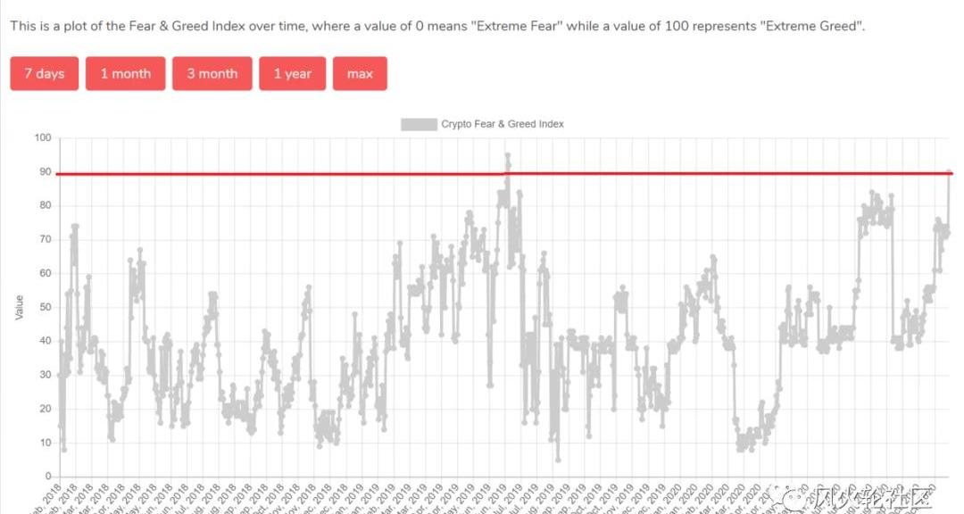 到今天各類公司機構持幣總量達到了81萬1233枚btc,占比特總量的3.86%(當然這中間包括灰度的部分)另外ok這個不能提幣已經有三周了,bitmex十月份因創始人的問題也受到了一定打擊,這些都是坊間共識的“空軍大本營”。。有可能從情緒面和流動性方面影響買賣盤,ok今天還發了個看上去是利好但還不能解決任何問題的安慰公告,只能說接著等吧,當然,現在唯一能再見到8萬開頭的大餅的還真的只剩ok了,有勇士敢梭嗎,下方留個爪哈。綜合上面提到的這些因素,市場狀態已經由昨天的貪婪指數72,飆升到90——極度貪婪狀態: