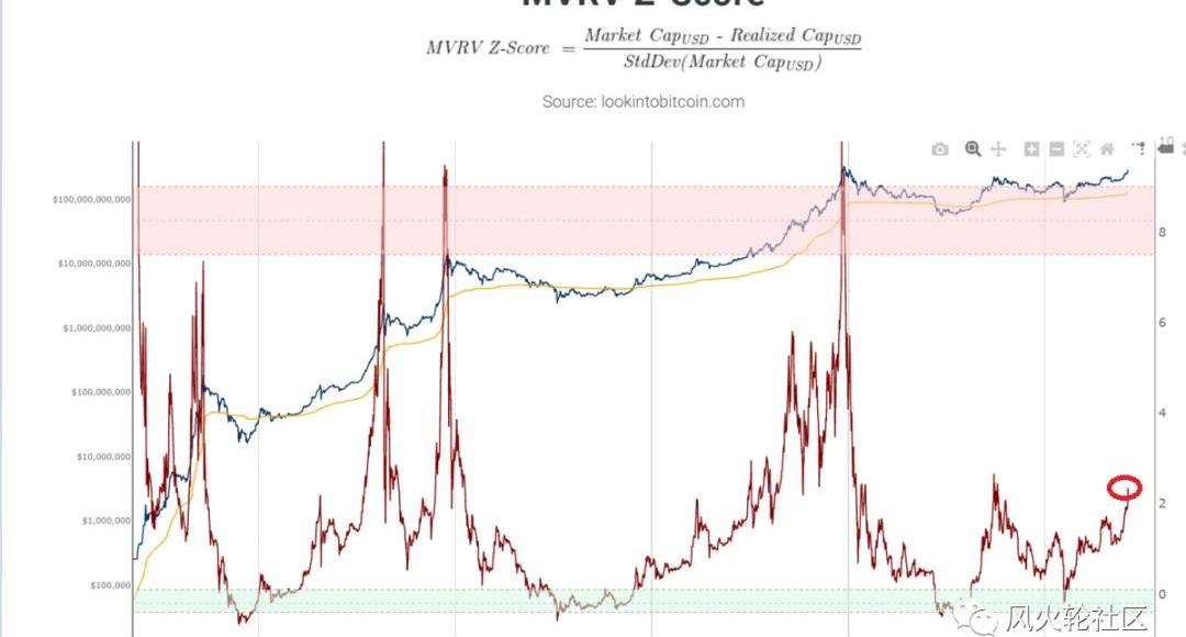 上一次是在2019年6月那個13000多的高點,當時這個指數最高升到了95。稍微有點可惜,我們翻不到18年以前的數據,17年大牛市的數據應該會有更多對比價值,通常來說fomo情緒會有短期持續,不過當達到90這個位置,已經是短期風險比較大了。同時還有兩個指標,一個是坊間流傳的逃頂神器——2個月累計漲幅,邏輯是當短期上升過快,市場很有可能出現大幅回調,2017年大牛的時候有兩波最高兩月漲幅分別是104%和140%,而我們現在2個月已經略微超過50%。另一個是MVRV指標,流通市值與實際市值(鏈上所有幣最后一次轉賬時價格之和)的比值,它通過鏈上行為來反應市場熱度,這一比值在昨天突破了2: